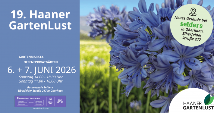 Beides wird weiterhin vom Verein Haaner GartenLust e.V. ehrenamtlich organisiert. Wir freuen uns auf viele Aussteller, Besucher, offene Gärten und interessierte Gartenfreunde!